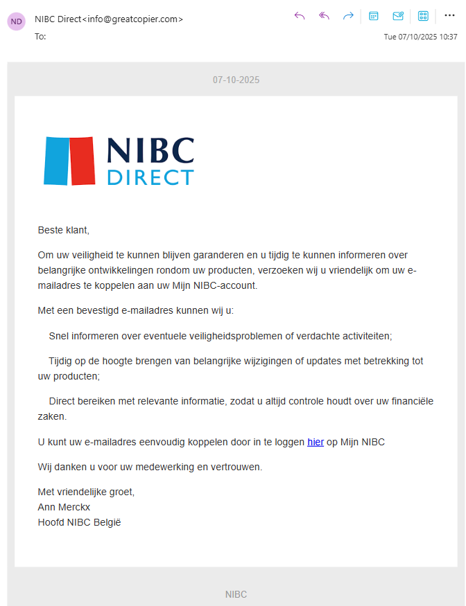 - Le champ réservé à l'adresse de l'expéditeur contient parfois une adresse factice. Vérifiez toujours qu'il s'agit bien de l'adresse de votre banque. Celle de NIBC est info@nibc.be. En cas de doute, contactez votre banque par les moyens habituels et ne répondez pas à l'e-mail.