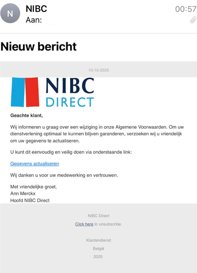 Laat je niet misleiden door een e-mail die afkomstig lijkt van een bekend bedrijf waarin je onder het mom van 'controle of update van bestanden' gevraagd wordt om te klikken op een link om je persoonlijke gegevens aan te vullen. NIBC, of een andere bank, zal je nooit zelf contacteren om je gegevens op te vragen of te laten wijzigen.